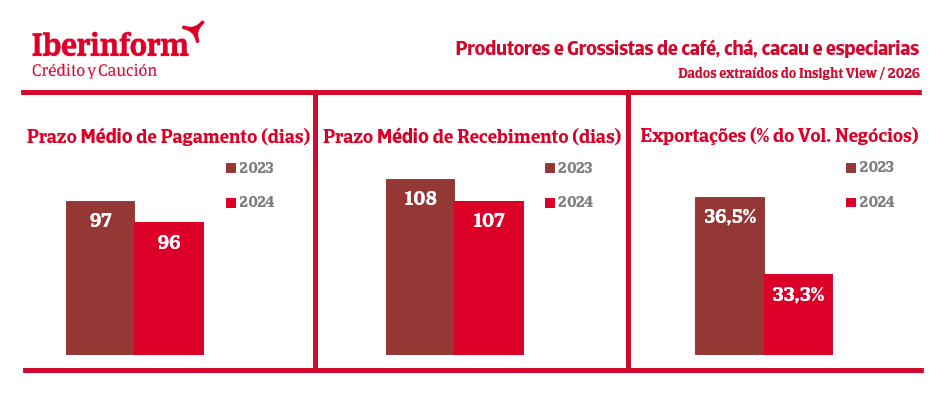 Embora de uma forma algo tímida, são registadas melhorias, tanto no prazo médio de pagamento como no prazo médio de recebimento, que respetivamente, passam para 96 e 97 dias, com uma redução de um dia em cada face ao período económico anterior. Estes indicadores sugerem que tanto os produtores de café e chá quanto os grossistas de café, chá, cacau e especiarias possuem alguma estabilidade na gestão do fluxo de caixa, o que reduz o risco percebido para clientes e fornecedores.