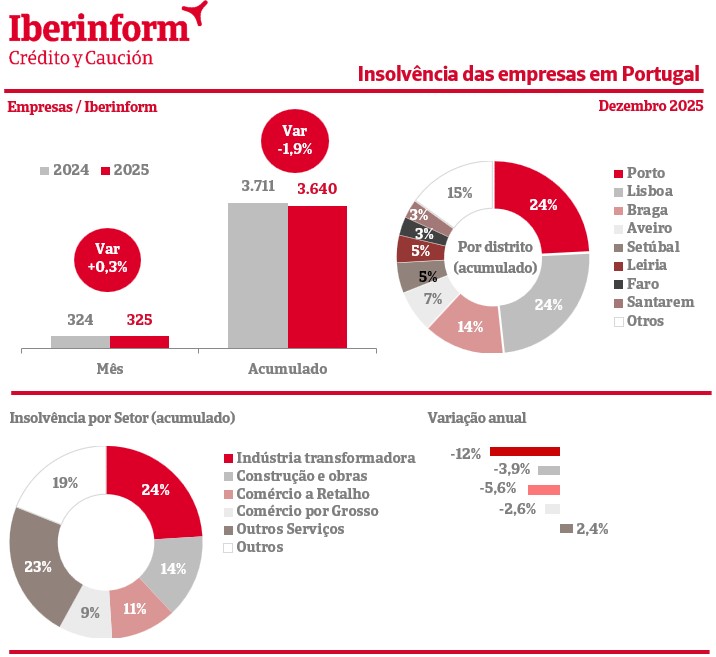 Em dezembro de 2025, o número de insolvências apresentou um ligeiro aumento de 0,3% em comparação com o mês homólogo de 2024. No entanto, em termos acumulados, o total de ações de insolvência registadas ao longo de 2025 evidenciou uma redução de 2% face ao mesmo período do ano anterior. No total, foram registadas 3.640 empresas insolventes em 2025, menos 71 do que em 2024.