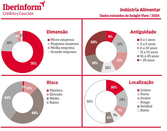 A distribuição geográfica das empresas alimentares é bastante dispersa, com uma concentração significativa nos cinco principais distritos: Lisboa (16%), Porto (14%), Aveiro (7%), Braga (7%) e Setúbal (6%), que juntos abrigam metade das empresas do setor.