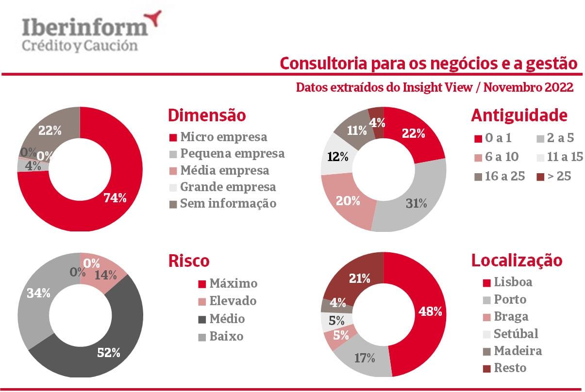 Os dados fornecidos pelo Insight View revelam que as consultoras para os negócios e gestão estão concentradas especialmente nos grandes centros urbanos: Lisboa (48%), Porto (17%), Braga (5%), Setúbal (5%) e Madeira (4%). Nos cinco distritos líderes do setor, a distribuição do risco é bastante semelhante.