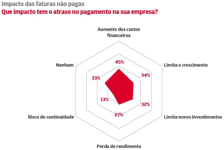 De acordo com o Estudo de Gestão do Risco de Crédito, 45% das empresas portuguesas registaram aumentos nos seus custos financeiros decorrentes da morosidade e 34% foram obrigadas a travar a sua expansão comercial. Além disso, 32% das empresas inquiridas devem limitar os seus novos investimentos e 27% enfrentam perdas de receitas significativas.
