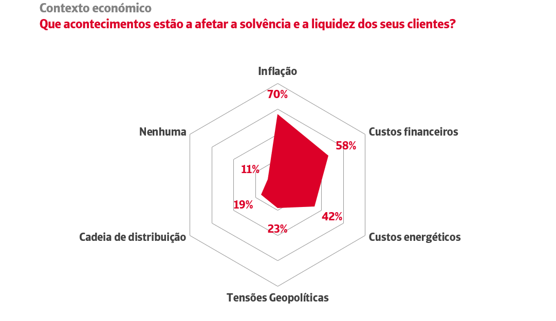 Como principal causa da deterioração do risco de crédito e da capacidade de pagamento da sua carteira comercial, o tecido produtivo aponta o aumento da inflação (referido por 70% das empresas), seguido do aumento dos custos financeiros (58%), da evolução dos custos energéticos (42%), das tensões geopolíticas (23%) e dos problemas da cadeia de fornecimento (19%).
