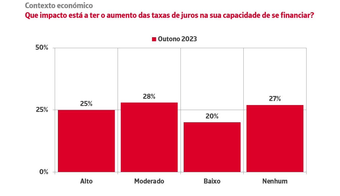 A percentagem de empresas que menciona os efeitos dos custos financeiros na solvência e liquidez dos seus clientes aumentou 50 pontos face aos níveis de há um ano, em linha com o progressivo aperto da política monetária. De facto, 73% das empresas esperam que a subida das taxas de juro afete a sua própria capacidade de acesso a financiamento e 25% do tecido empresarial espera que o impacto seja elevado.