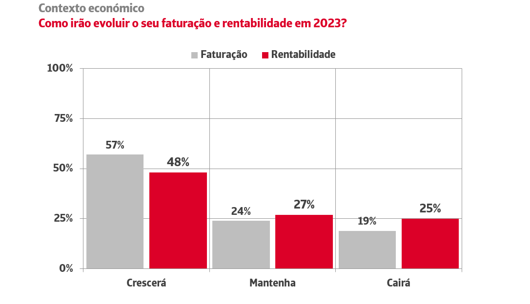 Até ao final de 2023, a maioria das empresas espera um crescimento tanto do volume de negócios (57%), como dos lucros (48%), bem acima das empresas que esperam quedas nos dois indicadores: 19% e 25%, respetivamente.