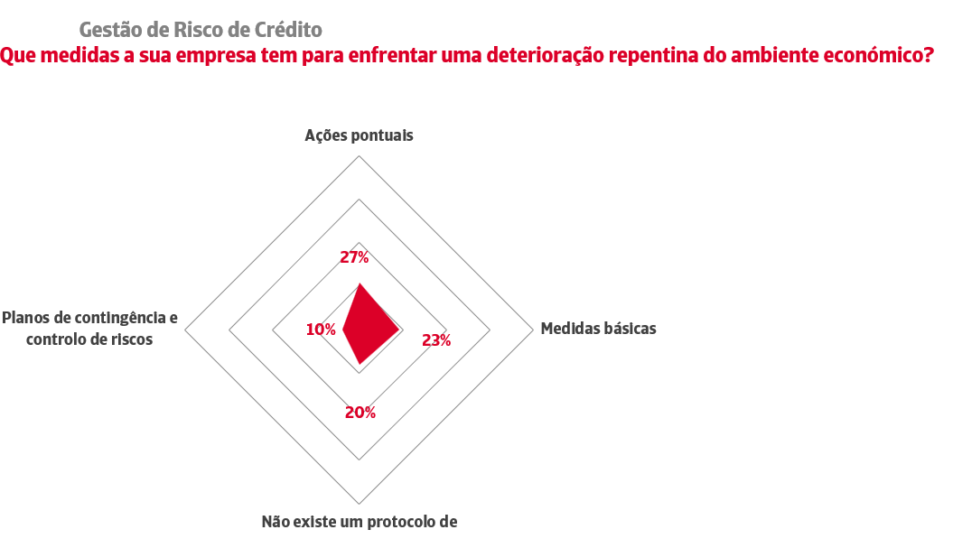 Além disso, a consulta realizada a cerca de 250 gestores de empresas mostra que 20% das empresas não têm qualquer tipo de estratégia preparada face a uma mudança negativa no contexto comercial e económico, o que traz vulnerabilidade à gestão de riscos. Por sua vez, 23% das empresas afirmam ter medidas básicas e 27% afirmam desenvolver ações específicas para contrariar as mudanças negativas na economia.