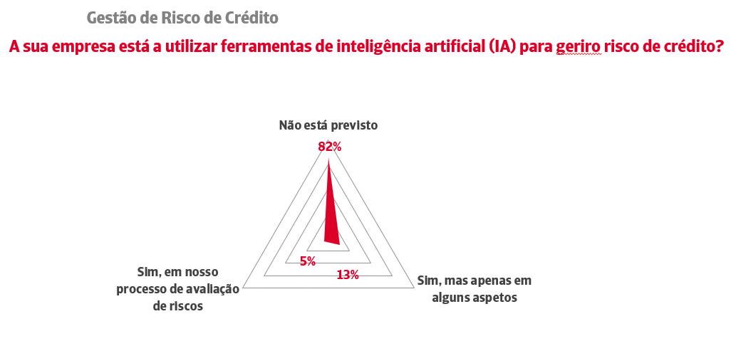 A Inteligência Artificial permite processar grandes volumes de dados históricos e em tempo real para antecipar cenários financeiros como quedas de receitas ou não pagamentos, ajudando a antecipar, mitigar e responder mais rapidamente aos desafios económicos. No entanto, o Estudo de Gestão de Risco da vaga do outono reflete a relutância das empresas em incorporar ferramentas de IA na gestão do risco de crédito, uma vez que apenas 5% das mais de 300 empresas consultadas afirmam tê-la incorporado nos processos de avaliação. No entanto, 82% não consideram o uso dessa tecnologia na gestão do risco de crédito.