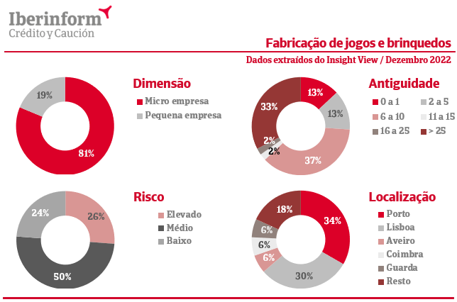 Os dados fornecidos pelo Insight View revelam que as empresas que fabricam jogos e brinquedos estão concentradas, com maior expressão, nos grandes centros urbanos: Porto (34%), Lisboa (30%), Aveiro (6%), Coimbra (6%) e Guarda (6%). Nos cinco distritos líderes do setor, a distribuição do risco apresenta algumas diferenças: as duas grandes metrópoles, Porto e Lisboa, apresentam um risco médio, tal como o distrito da Guarda, contudo Aveiro e Coimbra apresentam um score médio elevado.