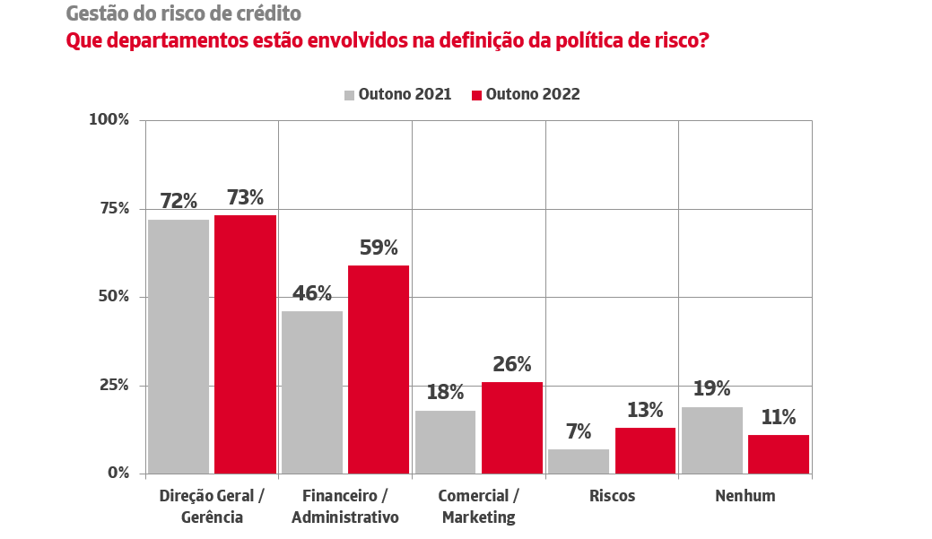 A tendência evidencia-se com clareza na evolução do peso específico dos diferentes departamentos na definição da política de riscos. 59% dos departamentos financeiros e administrativos estiveram envolvidos na gestão das políticas de riscos comerciais, o que representa um salto de catorze pontos em relação aos valores obtidos há um ano. 13% das empresas contam já com um departamento de riscos específico, percentagem que duplica o valor registado na vaga de outono de 2021. Também os departamentos comerciais e de marketing estão a ver aumentar a sua participação direta na gestão do risco comercial. Apesar deste incremento na seleção técnica dos clientes em função do seu risco creditício, continuam patentes algumas debilidades. 11% das empresas ainda não aplicam uma política de riscos para gerirem possíveis incumprimentos nos seus processos de prospeção.