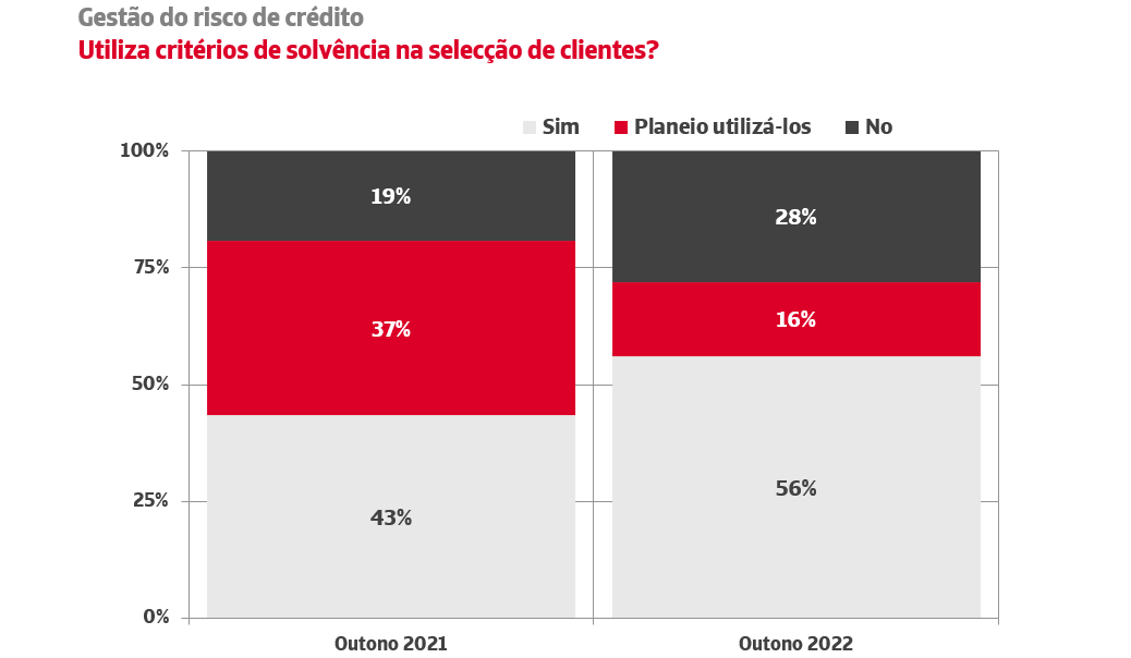 O dado positivo evidenciado por este Estudo é a evolução no uso de critérios de solvência na seleção de clientes. A percentagem de empresas que gerem de forma deficiente o seu risco de crédito por não utilizarem critérios de solvência na seleção de clientes cai treze pontos percentuais face a 2021, para se situar nos 44%. Esta falta de análise é uma carência estrutural em termos de proteção do tecido empresarial português face aos efeitos da morosidade.