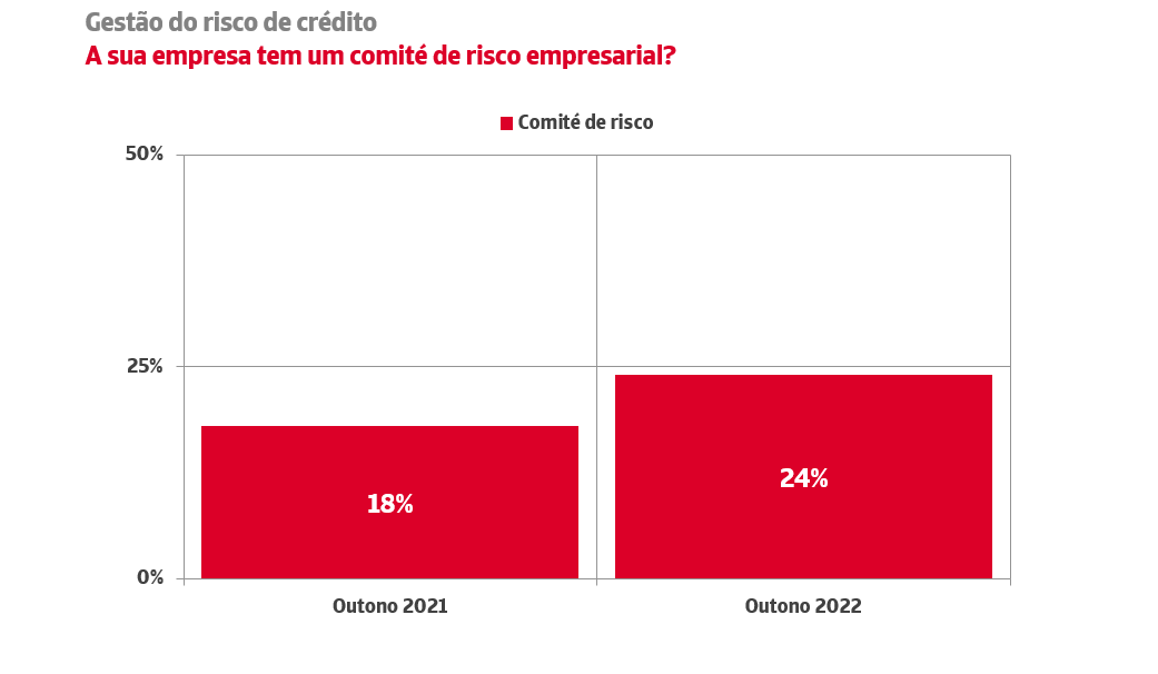 Também se regista uma consolidação nos comités de gestão de riscos. 24% das empresas, seis pontos mais que na vaga homóloga de 2021, conta já com estas estruturas para o controlo sistemático e transversal da carteira de clientes que permite a revisão, aprovação e recomendação de limites na exposição ao risco.