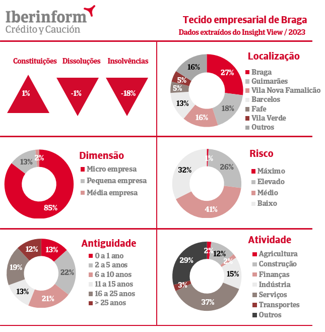 A dispersão também é evidente no setor de atividade em Braga: 37% das empresas atuam no setor de serviços. No entanto, essas empresas contribuem apenas com 9% do volume total de negócios do distrito. Os setores restantes em destaque são a indústria, que representa 15% do total de empresas de Braga, mas é responsável pelo maior volume de negócios, com 43% do total; e os setores denominados como "Outros" (29%), que contribuem com 32% do volume total de negócios, demonstrando que os setores menos tradicionais têm uma relevância significativa para a economia de bracarense.