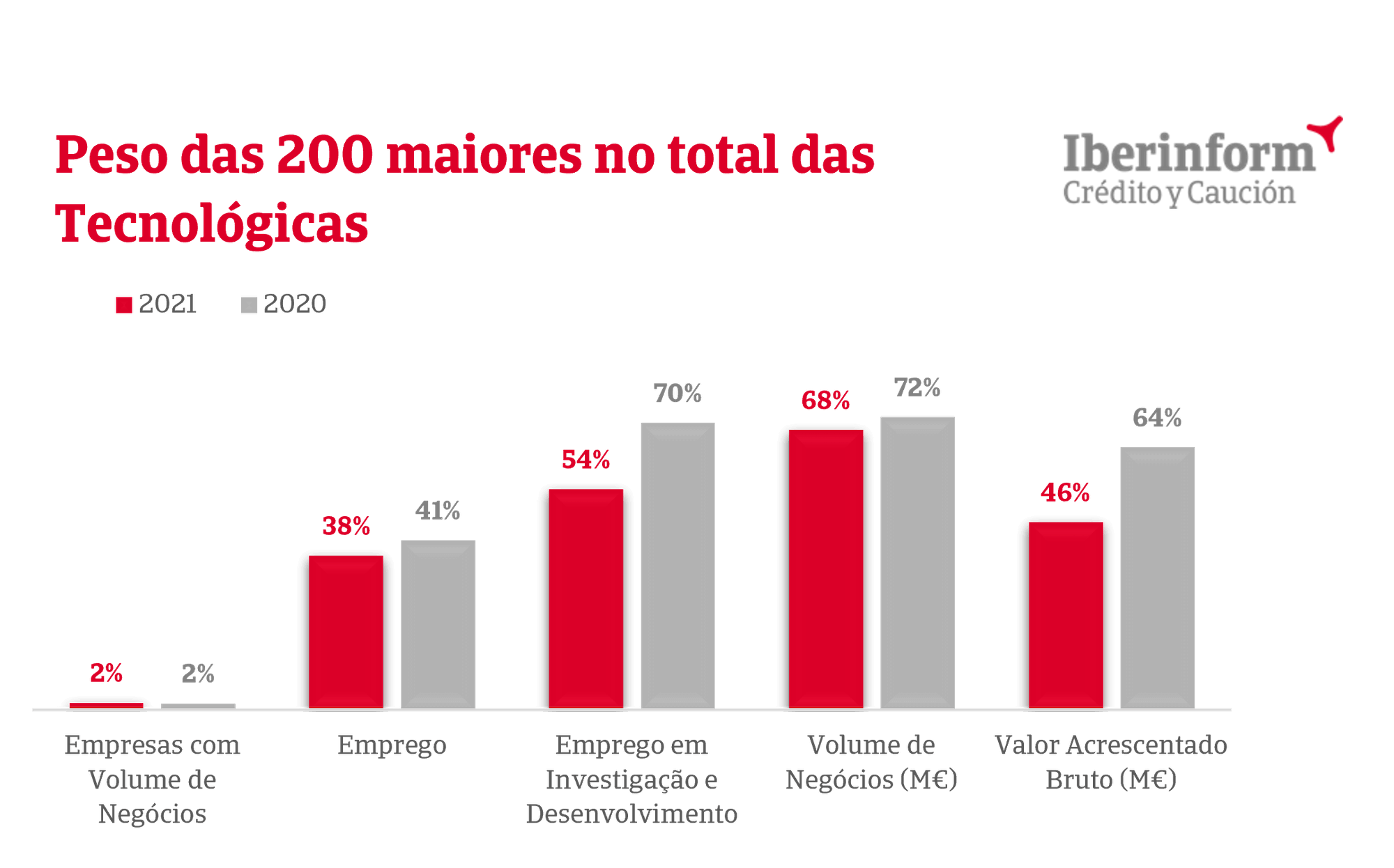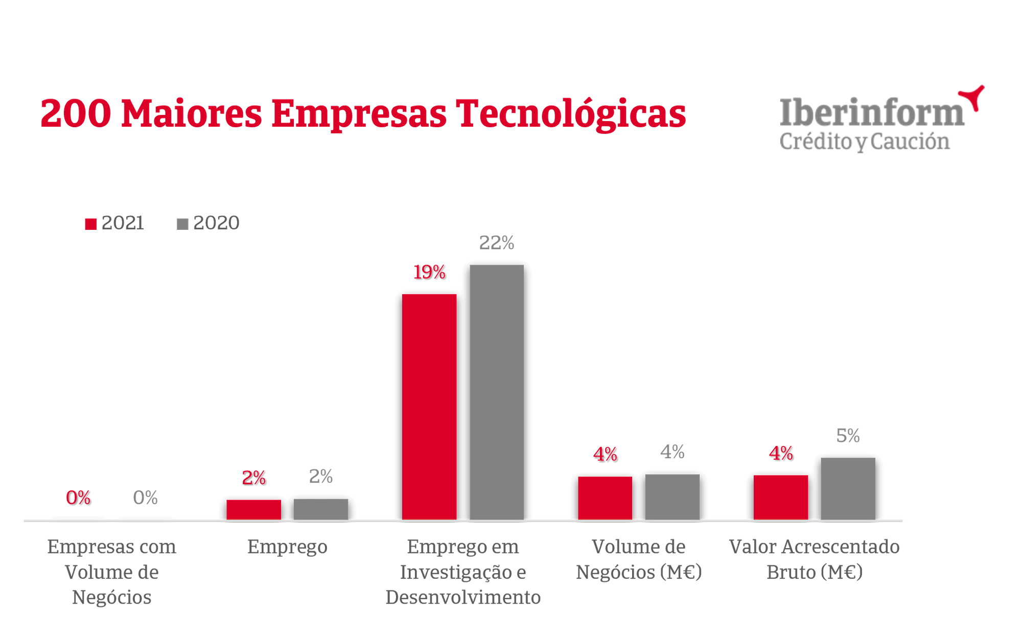 Segundo a informação da Iberinform, dentro das 200 Maiores Empresas de Atividades Económicas Tecnológicas, destaque para o facto de representar 2% da totalidade do emprego em Portugal. No entanto, o emprego em Investigação e Desenvolvimento, representa 19% (-3% comparado com 2020). Relativamente ao Volume de Negócios, este mantém-se nos 4% do total do país. O Valor Acrescentado Bruto teve uma diminuição de 5% para 4%, no presente ano.