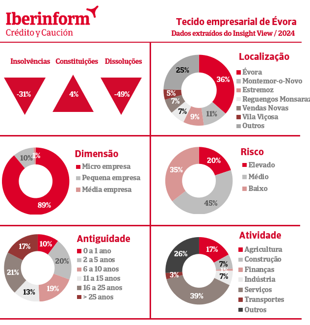 No ano de 2023, o distrito de Évora registou uma diminuição significativa de 31% nos processos de insolvência e de 49% no número de dissoluções de empresas, em comparação com o ano anterior. Em 2023 foram constituídas 531 empresas novas em Évora, o que representa um aumento de 4% em relação a 2022.