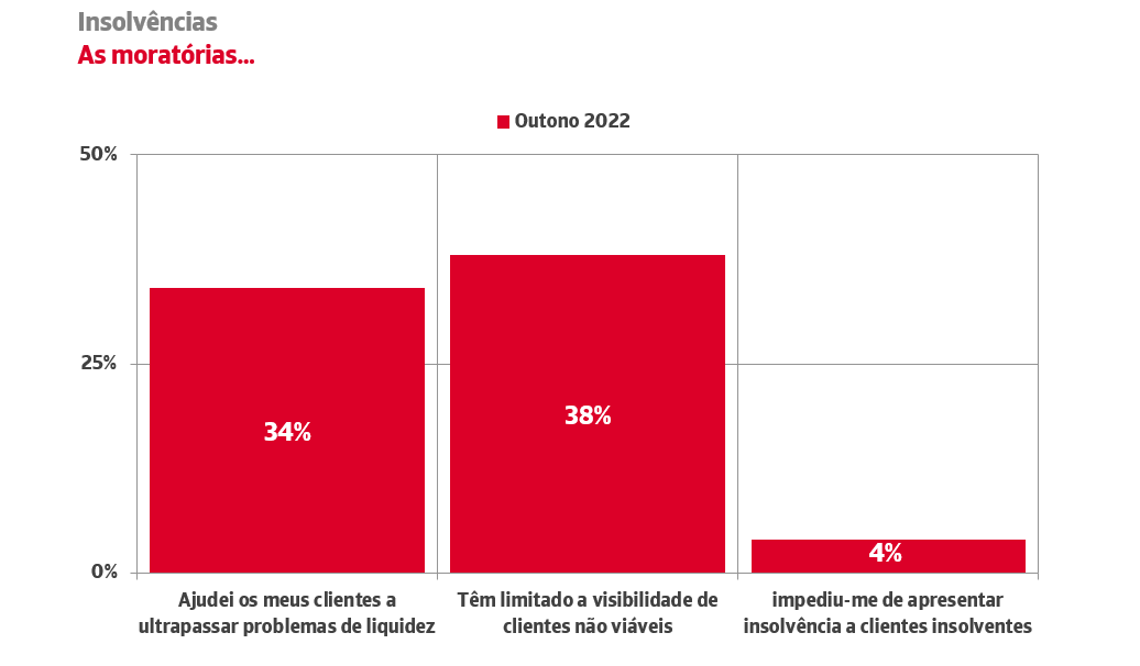 O balanço das moratórias tem efeitos opostos. 34% das empresas admitem que o período de excecionalidade ajudou os seus clientes a superar os problemas de liquidez durante a pandemia. Contudo, uma percentagem superior, 38%, referem que as moratórias limitaram a sua capacidade de detetar e gerir o possível impacto de uma situação de insolvência e a possibilidade de deixar de vender a clientes inviáveis. Por último, 4% das empresas inquiridas sentiram que não avançaram para processos de insolvência por causa da situação excecional de apoio decorrente das moratórias.