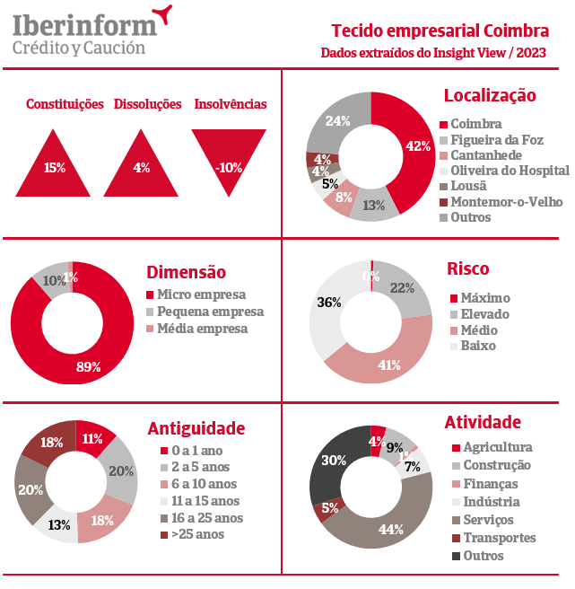 O distrito de Coimbra é composto por 17 concelhos e o seu tecido empresarial representa cerca de 4% do total de empresas portuguesas que apresentaram as suas contas. As empresas estão distribuídas entre os concelhos, sendo que Coimbra lidera em número de empresas, com 42% do total, seguida por Figueira da Foz (13%), Cantanhede (8%), Oliveira do Hospital (5%), Lousã (4%) e Montemor-o-Velho (4%). Os restantes concelhos somam os 24% das empresas remanescentes.
