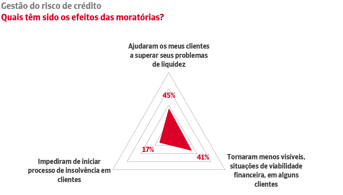45% das empresas confirma que as moratórias atingiram os propósitos para os quais foram desenhadas, ou seja, estas empresas contam nas suas carteiras de clientes com empresas que conseguiram fazer face aos problemas de liquidez gerados pela pandemia graças a este período de excecionalidade. Contudo, as moratórias também provocaram outros efeitos não desejados, ao impedir a realocação de recursos a empresas mais produtivas. 41% das empresas refere que as moratórias geraram uma maior transmissão dos problemas de solvência resultantes da morosidade na cadeia de fornecimento, já que continuaram a trabalhar com empresas com elevado risco de crédito por não estarem conscientes da sua inviabilidade. Nesse sentido, 17% do tecido empresarial confirma não ter podido, enquanto credor, dar início a pedidos de insolvência face ao incumprimento dos seus clientes.