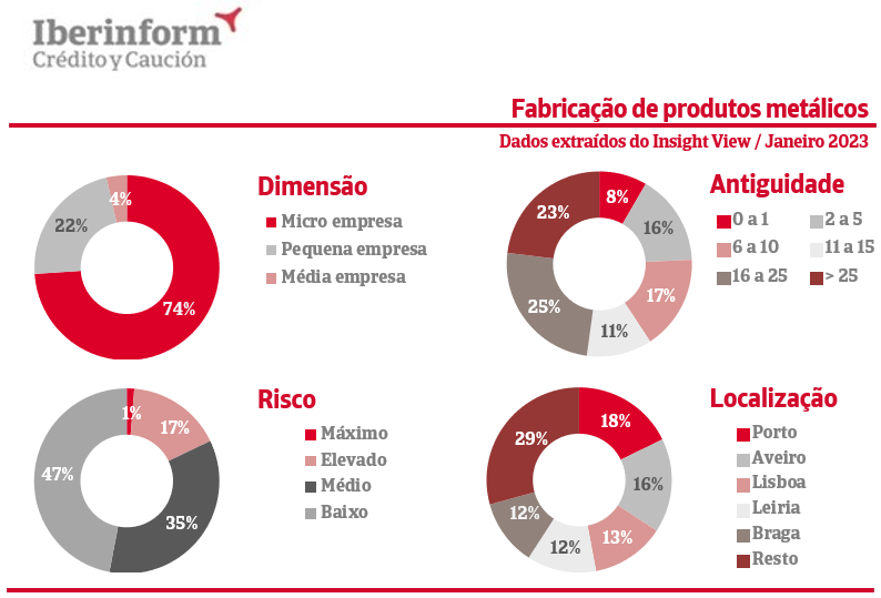 De acordo com os dados do Insight View, existe uma grande dispersão das empresas de fabricação de produtos metálicos, contudo a sua concentração é maior entre os grandes centros urbanos: Porto (18%), Aveiro (16%), Lisboa (13%), Leiria (12%) e Braga (12%). Dos cinco distritos líderes do setor, Lisboa é o que apresenta a menor deterioração do risco de crédito: 15% das empresas do setor encontram-se num nível máximo ou elevado de incumprimento. Seguem-se Leiria, Porto e Braga com 18% e Aveiro com 20%.