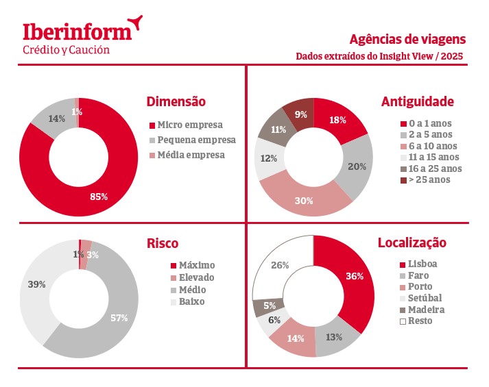 Segundo os dados do Insight View, cerca de 18% das empresas têm menos de um ano de existência. A proporção de empresas aumenta ligeiramente com o tempo de atividade, alcançando 20% para empresas com dois a cinco anos de existência e 30% para aquelas com seis a dez anos. As empresas com mais de 25 anos constituem apenas 9% do total, sendo, ainda assim, as que mais contribuem para o volume de negócios com uma percentagem de 37% do total e são as empresas onde o risco de incumprimento é menor.