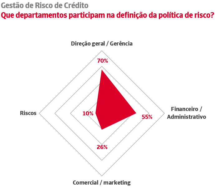 Face a este papel do diretor-geral como último decisor, a existência de unidades de risco continua a registar valores mínimos: apenas 10% das empresas conta com áreas especializadas na gestão de risco de crédito comercial. O peso da gestão técnica da política de riscos comerciais continua a recair, como uma tarefa mais, sobre os departamentos financeiros (55% das empresas), ocasionalmente em coordenação com as direções comerciais (26% das empresas) que fazem a gestão direta da carteira de clientes e a prospeção de vendas no mercado potencial.