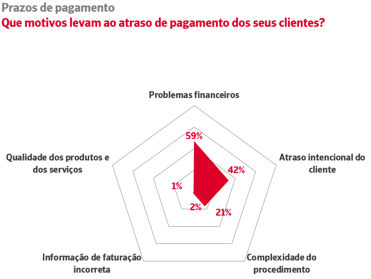 59% das empresas relatam problemas financeiros nos seus clientes. A falta de liquidez é, mais uma vez, a razão mais citada para explicar a morosidade nos pagamentos, à frente do atraso intencional (42%), da complexidade dos procedimentos de pagamento (21%), da emissão de faturas incorretas (2%) ou das discrepâncias quanto à qualidade dos bens ou serviços fornecidos (1%).