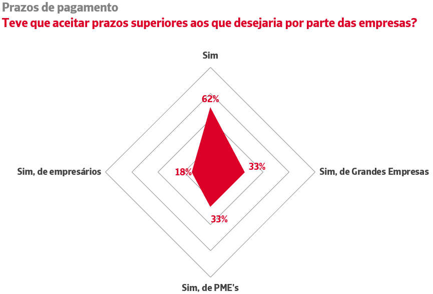 62% das empresas têm de aceitar prazos de pagamento superiores aos desejados para poderem manter as suas carteiras de clientes nas operações B2B. A capacidade dos profissionais independentes para imporem prazos de pagamento também se reduziu a 18%. No caso das PME e das Grandes Empresas essa valor situa-se nos 33%.