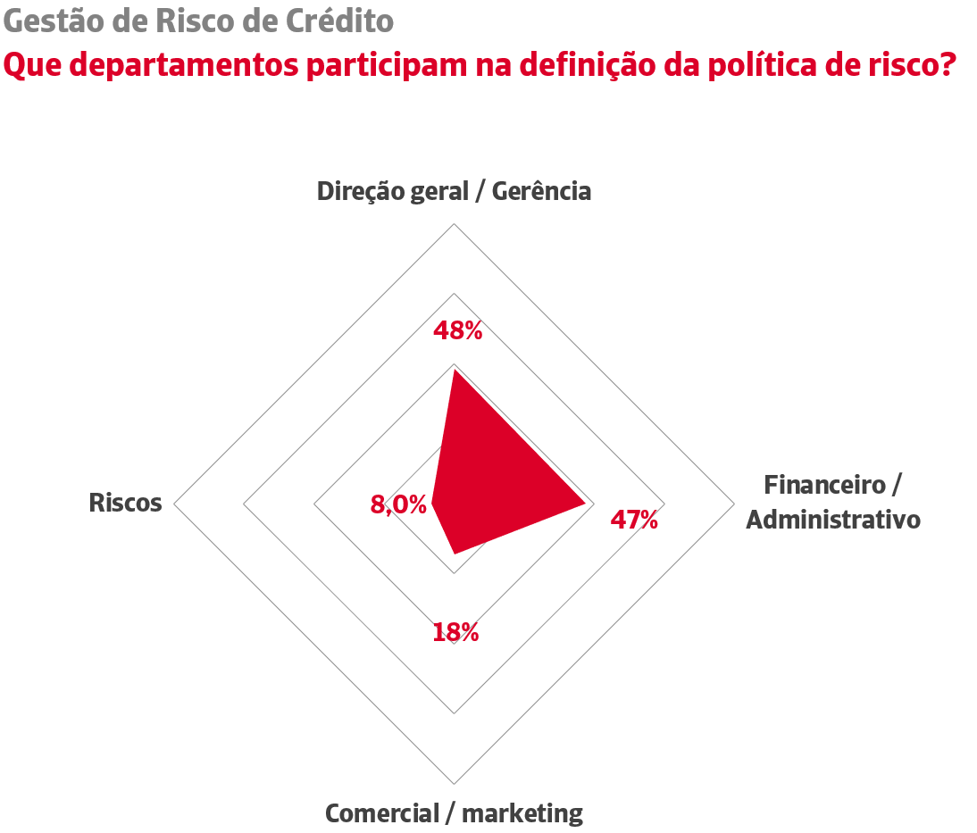 Face a este papel do diretor-geral como último decisor, a existência de unidades de risco continua a registar valores mínimos: apenas 8% das empresas conta com áreas especializadas na gestão de risco de crédito comercial. O peso da gestão técnica da política de riscos comerciais continua a recair, como uma tarefa mais, sobre os departamentos financeiros (47% das empresas), ocasionalmente em coordenação com as direções comerciais (18% das empresas) que fazem a gestão direta da carteira de clientes e a prospeção de vendas no mercado potencial.