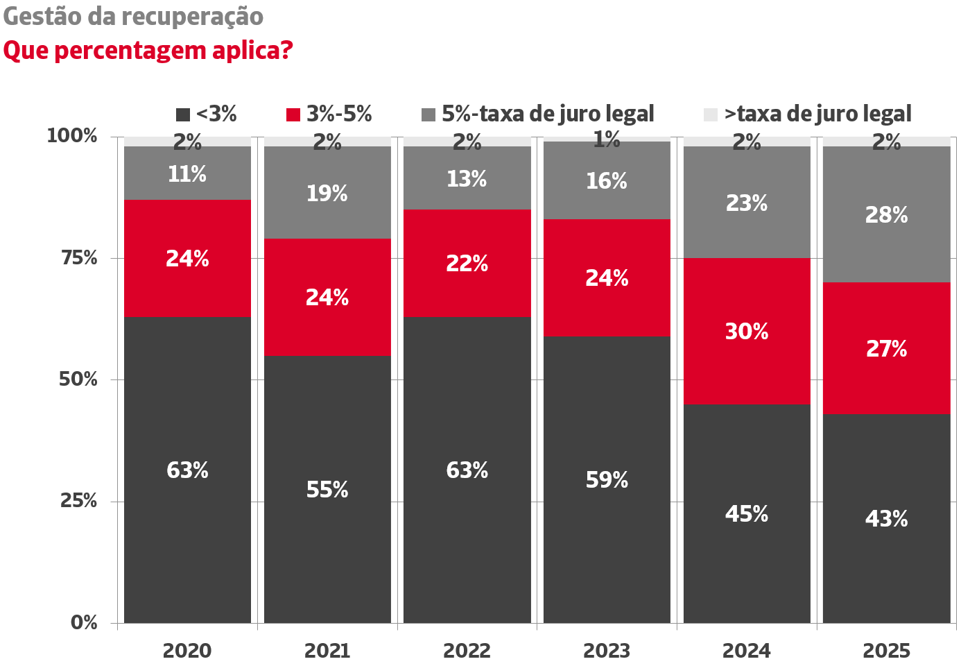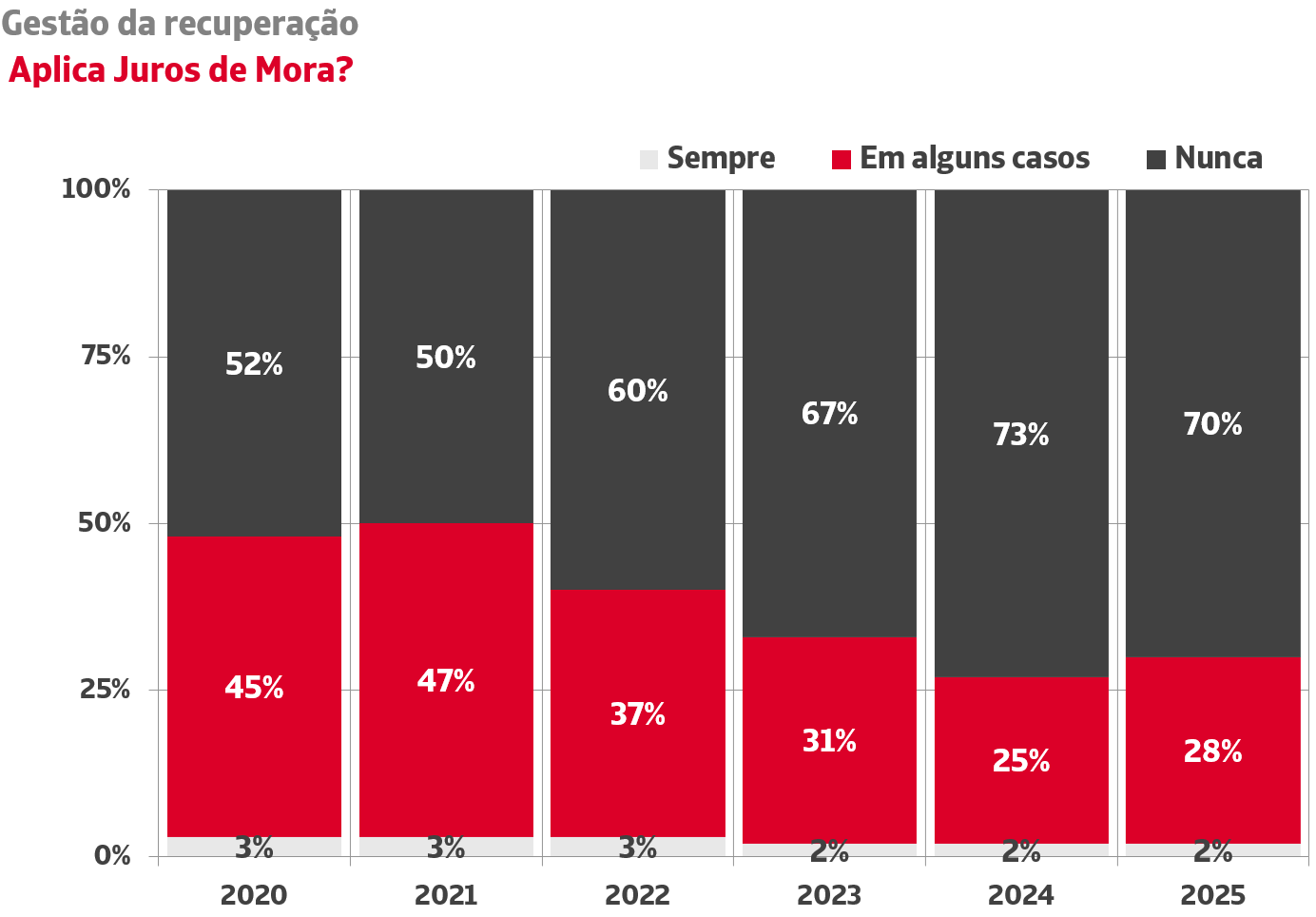 Quando são iniciadas ações de cobrança, a grande maioria das empresas renuncia à cobrança de juros de mora; 70% das empresas nunca os aplicam e apenas 2% são sistemáticas no exercício do seu direito. O endurecimento da política monetária por parte do Banco Central Europeu fez com que os juros de mora subissem até ao máximo de 12,5% em 2024. Atualmente, esta taxa está fixada em 8,87%. No entanto, a evolução deste indicador oficial não tem tradução na economia real. De acordo com o estudo realizado pela Crédito y Caución e Iberinform, 98% das empresas que aplicam juros de mora reclamam montantes inferiores aos que lhes corresponderiam por lei.