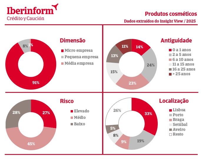 No que se refere ao risco empresarial, 27% das empresas de produtos cosméticos enfrentam um risco elevado de incumprimento, sendo que 42% dessas empresas foram criadas nos últimos cinco anos. A distribuição de risco é relativamente homogénea, com 45% das empresas classificadas como de risco médio e as restantes 28% como de risco baixo.