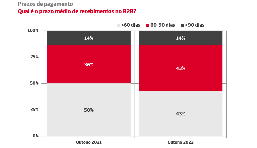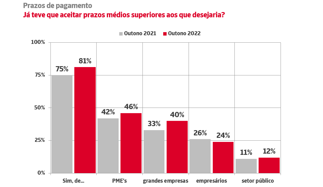 As PME são o segmento que apresenta pior comportamento: 46% das empresas veem-se obrigadas a aceitar uma extensão dos prazos de pagamento dos seus clientes de pequena ou média dimensão, quatro pontos mais que há um ano. Regista-se também um significativo agravamento entre as grandes empresas: 40% das empresas devem aceitar prazos superiores dos seus grandes clientes, sete pontos mais que há um ano. A capacidade dos profissionais liberais para imporem prazos de pagamento situa-se nos 24%, um valor inferior face aos resultados da vaga homóloga de 2021.