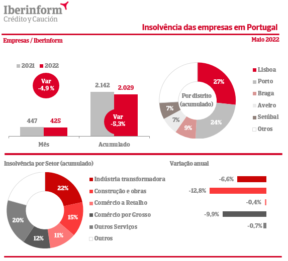 Até final de maio de 2022 e face a igual período de 2021, as declarações de insolvência requeridas por terceiros diminuíram 12,9%, com menos 51 pedidos apresentados e um total de 344 ações. As apresentações à insolvência pelas próprias empresas baixaram 3,1% o que se traduz em menos 13 pedidos. Os encerramentos com plano de insolvência diminuíram 23,8% (menos 5 processos).