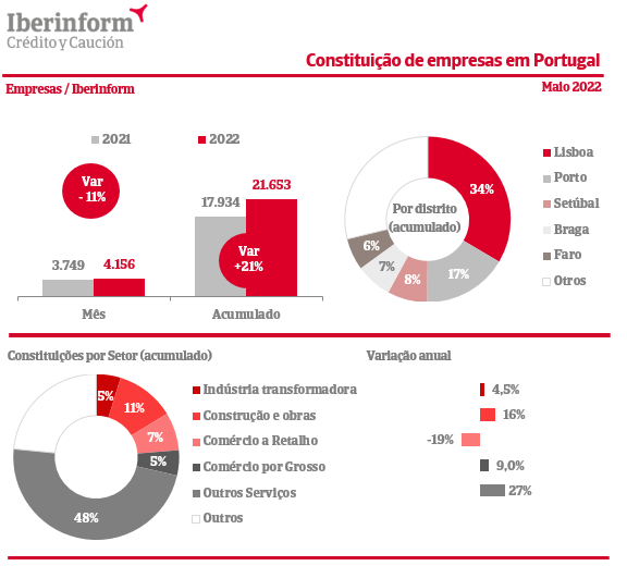 Em maio, as constituições aumentaram 10,9% face ao período homólogo de 2021, passando de 3.749 para 4.156 novas empresas. Em termos acumulados verifica-se um acréscimo de 20,7% com mais 3.719 empresas criadas que no mesmo período do ano passado. O total de novas empresas é de 21.653.