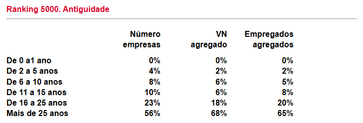 Mais de 75% das empresas deste ranking são empresas com maturidade, 56% têm mais de 25 anos e 23% têm entre 16 e 25 anos de constituição. Entre as grandes empresas apenas 4% são empresas jovens com 2 a 5 anos de antiguidade.