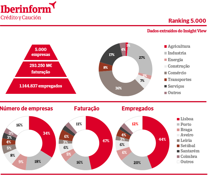 As 5.000 maiores empresas portuguesas agregam mais de 293.250 milhões de euros em volume de negócios anual, mais 2% do que as 5000 maiores do ano anterior. Estas empresas geram 1.144.837 de emprego, mais 6% do que no ano anterior. Segundo a análise realizada pela Iberinform, no Insight View, sobre as maiores empresas de Portugal. Comparativamente ao ano anterior representa um aumento de 2%, no volume de negócios e de 6% no emprego direto. 50% de empresas exportam agregando um valor de 74 517 M€ em exportações, mais 5% do que no ano anterior.
