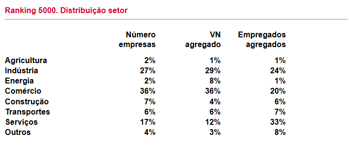 Os grandes setores que compõem este Ranking 5.000: Comércio 36% das empresas, com 29% do volume de negócios e 24% do emprego. O setor da Indústria representa 27% das empresas, 29% do volume de negócios e 24% dos empregos. Os serviços detêm 17% das empresas, 12% do volume de negócios e 33% dos empregos.