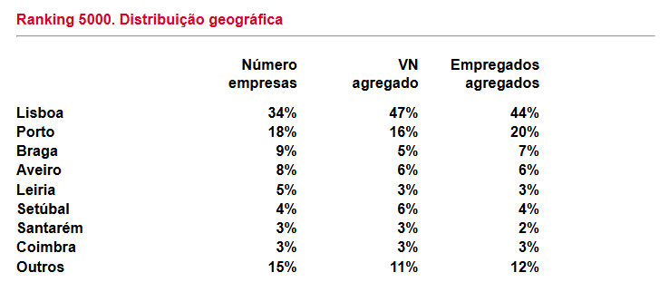 Das 5.000 maiores empresas portuguesas: 34% têm sede em Lisboa, seguidas de (18%) localizadas no Porto. Mantendo a tendência em termos de rendimento e de criação de emprego. Lisboa ocupa o 1º lugar no ranking do agregado de volume de vendas com 47% e 44% na criação de emprego. O distrito do Porto ocupa o 2º lugar com 16% da totalidade de volume de vendas e 20% do emprego.