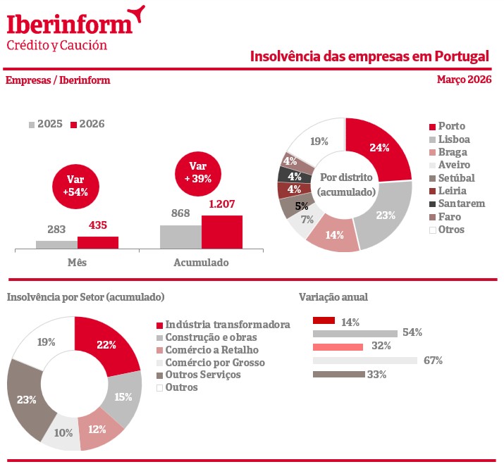 As ações de insolvência registadas em março de 2026 aumentaram em termos homólogos 54% atingindo um total mensal de 435 empresas insolventes, mais 152 que em março de 2025. Em termos acumulados, o aumento é ligeiramente superior a 39%, com um total de 1.207 insolvências contra 868 no ano transato.