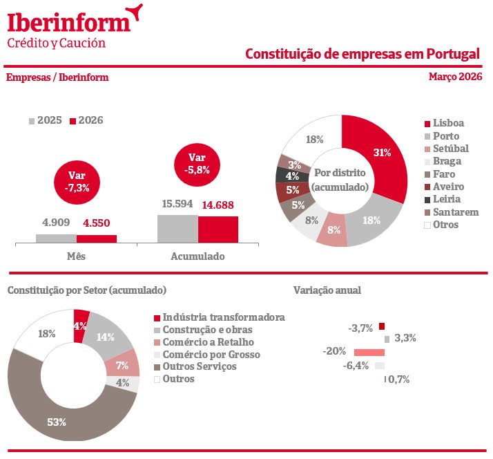 No que respeita à criação de novas empresas, março de 2026 encerra com uma diminuição de 359 constituições face ao ano transato, decrescendo de 4.909 para 4.550 novas empresas constituídas (-7%). O acumulado ascende a 14.688 novas empresas criadas em 2026, menos 906 do que em 2025 - decréscimo de 6%.