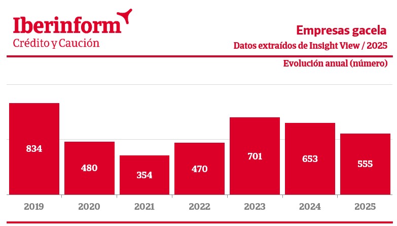 De acuerdo con la información mercantil procesada por Insight View, España cuenta con 555 empresas gacela. Esto supone una caída del -15% respecto a 2024, aumentando la distancia con respecto a los niveles prepandémicos de 2019 (-33%) . Las empresas gacela son compañías que, a pesar de tener menos de cinco años de vida, han logrado generar diez o más empleos y facturar por encima del medio millón de euros acumulando crecimientos anuales superiores al 20% en los tres últimos ejercicios.