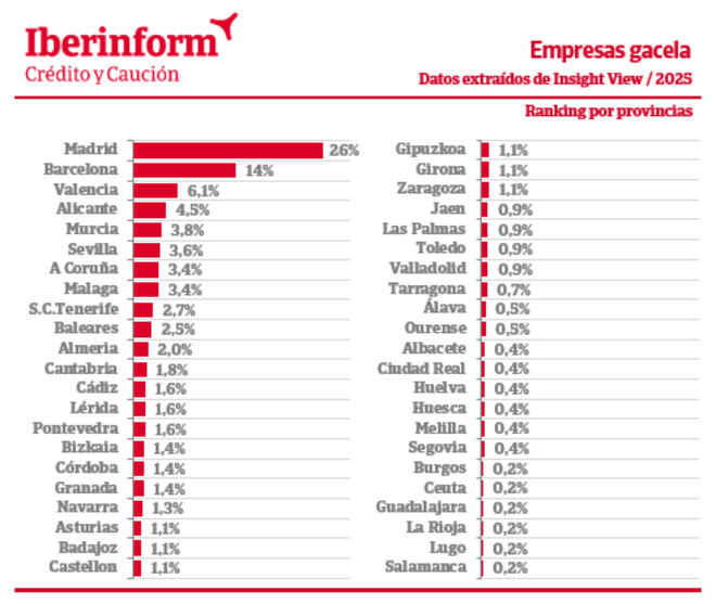 El análisis por provincias subraya todavía más el liderazgo de Madrid (26%) como clúster de empresas gacela, a mucha distancia de Barcelona (14%), Valencia (6,1%), Alicante (4,5%), Murcia (3,8%), Sevilla (3,6%), A Coruña y Málaga (3,4%), Santa Cruz de Tenerife (2,7%), Baleares (2,5%), Almería (2,0%), Cantabria (1,8%) y Cádiz, Lérida y Pontevedra (1,6%). Ávila, León, Soria y Zamora son las únicas provincias españolas que no cuentan con ninguna empresa gacela.
