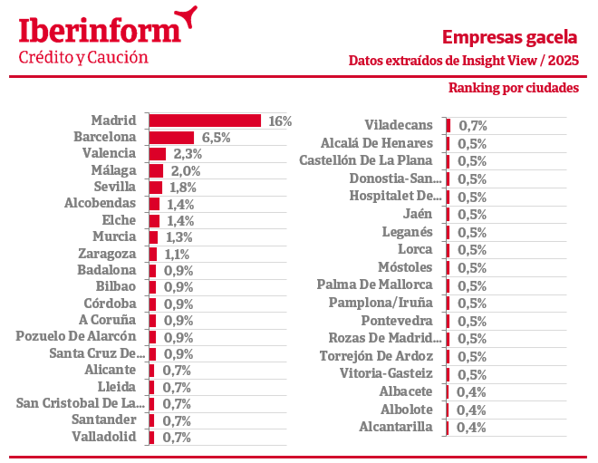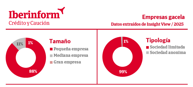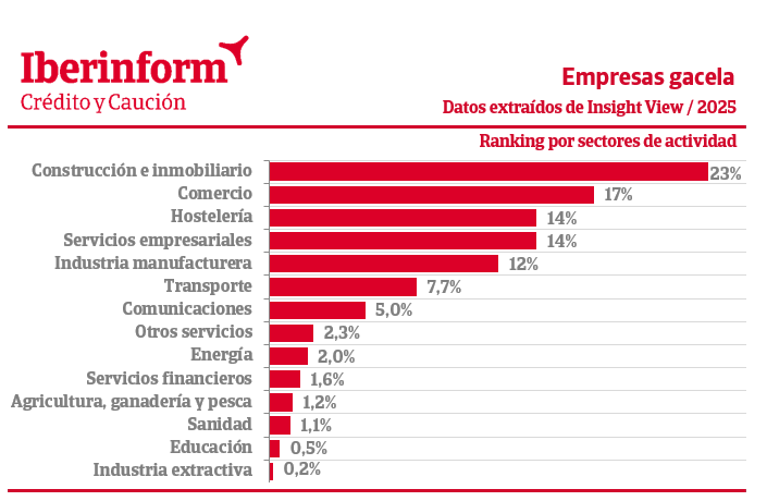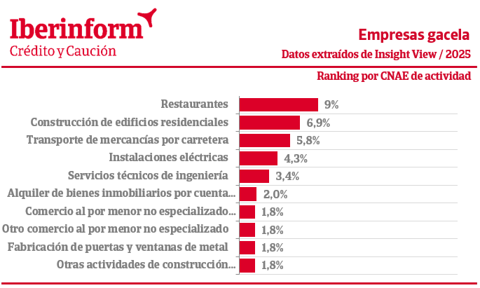 La actividad de las empresas gacela se dispersa en 169 diferentes CNAE de actividad. El de mayor peso son los restaurantes, que supone un 9% de las gacelas de 2025. Le siguen en importancia la construcción de edificios residenciales (6,9%), el transporte de mercancías por carretera (5,8%), y las instalaciones eléctricas (4,3%). El rápido crecimiento de estas empresas no es siempre sinónimo de salud financiera. De acuerdo con el análisis de Iberinform, el 5,4% de las empresas gacela presenta un máximo o elevado riesgo de impago.