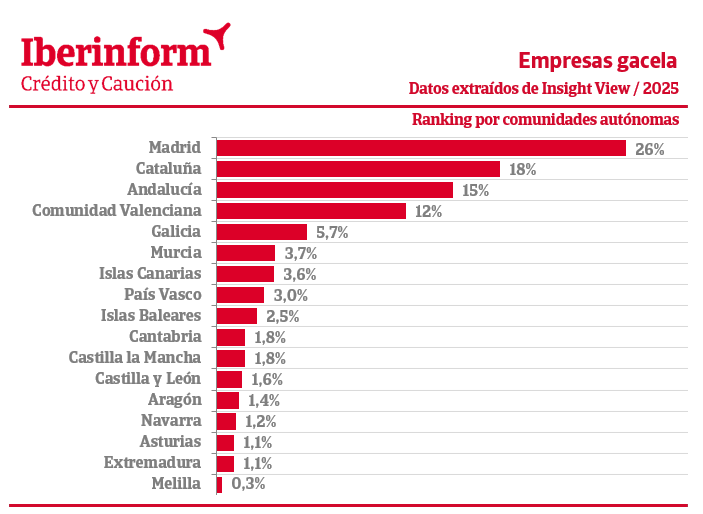 Todos los territorios autonómicos cuentan con presencia de empresas gacela en su tejido productivo. Madrid es la de mayor peso, con el 26% del total. Le siguen en importancia Cataluña (18%), Andalucía (15%) y Comunidad Valenciana (12%).