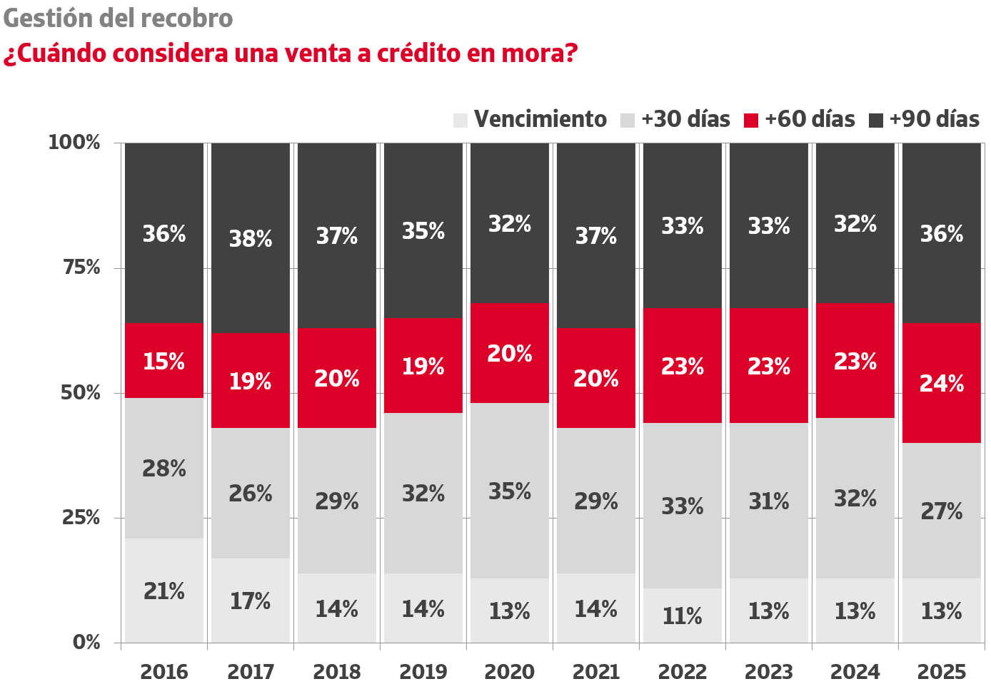 El retraso en las acciones de recobro implica un deterioro en la efectividad de la recuperación. A pesar de ello, el estudio refleja una gran flexibilidad de los plazos de recobro, como parte de la relación comercial. El 36% de las empresas permite a sus clientes retrasos en pagos de más de 90 días antes de considerar un crédito moroso.