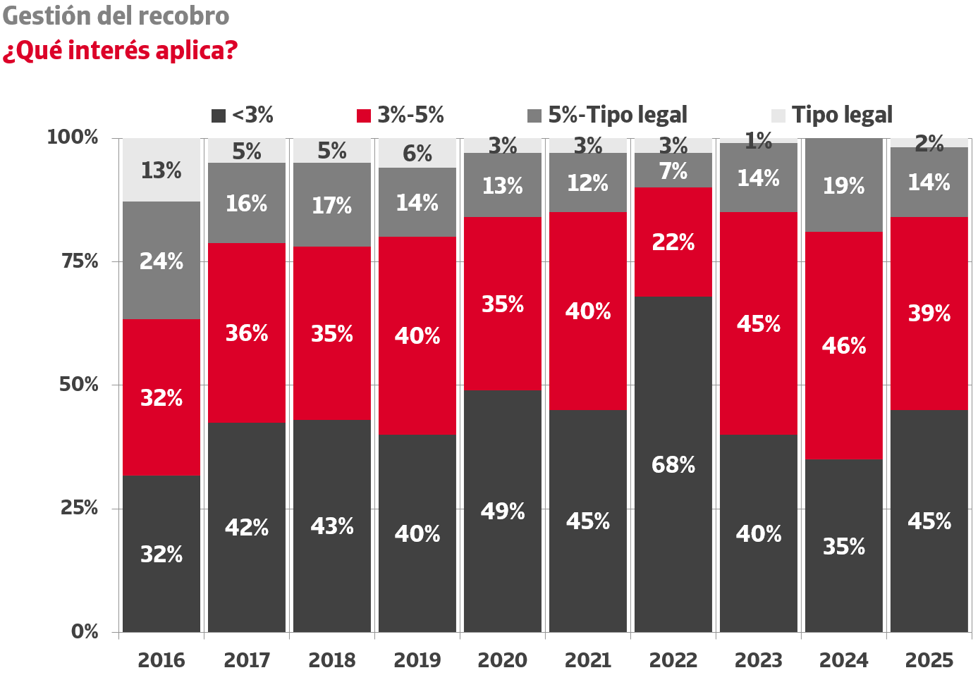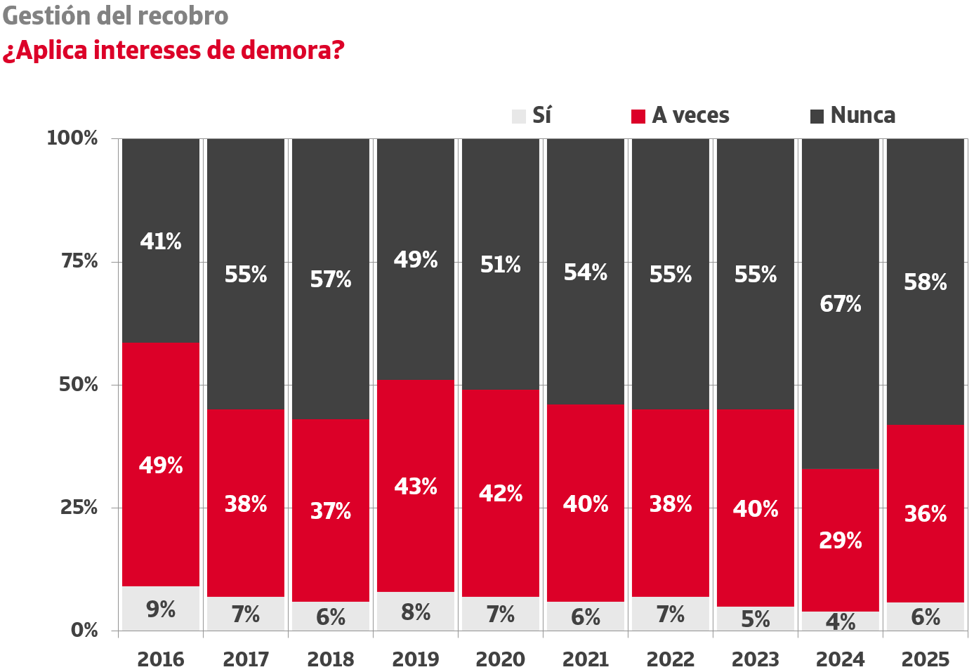 Cuando se inician las acciones de recobro, la inmensa mayoría de las empresas renuncia al cobro de intereses de demora. El 58% de las empresas no los aplica nunca y solo el 6% es sistemático a la hora de ejercer su derecho. Hasta 2022, los tipos de interés de demora para operaciones comerciales estuvieron fijados en el 8%. El endurecimiento de la política monetaria por parte del Banco Central Europeo provocó que se incrementasen hasta el máximo del 12,5% en 2024. En la actualidad, este tipo está fijado en el 11,15%. La variación de este indicador oficial no tiene, sin embargo, traslación a la economía real: según el Estudio elaborado por Crédito y Caución e Iberinform, el 98% de las empresas que aplican intereses de demora reclaman por debajo de los que le corresponden legalmente.