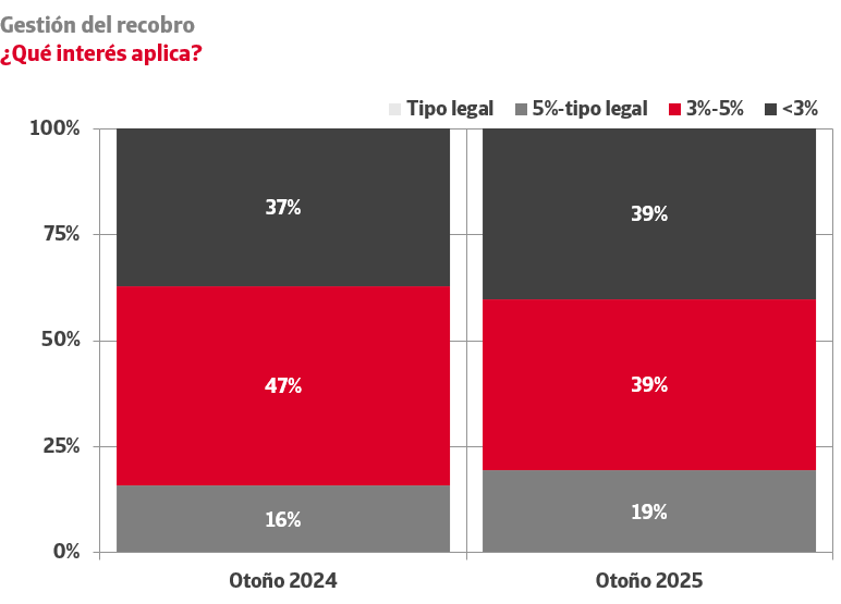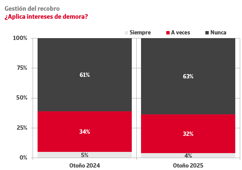 Cuando se inician las acciones de recobro, la inmensa mayoría de las empresas renuncia al cobro de intereses de demora. El 63% de las empresas no los aplica nunca y solo el 4% es sistemático a la hora de ejercer su derecho. Son niveles peores a los registrados hace un año, lo que indica el esfuerzo que están realizando las compañías por mantener la relación con sus clientes, a pesar del retraso en el pago.