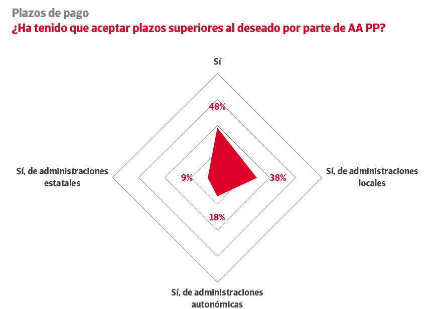 Aunque en menor medida, las Administraciones también forman parte del problema de la extensión indeseada de los plazos de pago: el 48% de las empresas que trabaja con el sector público tiene que aceptar plazos superiores a los deseados, tres puntos por encima a los niveles registrados en 2024. El peor comportamiento, que afecta al 38% de las empresas, se da entre las Administraciones locales. Este porcentaje se reduce en las Administraciones autonómicas (18%) y en las estatales (9%), a medida que desciende el nivel de competencias atribuidas a cada institución.