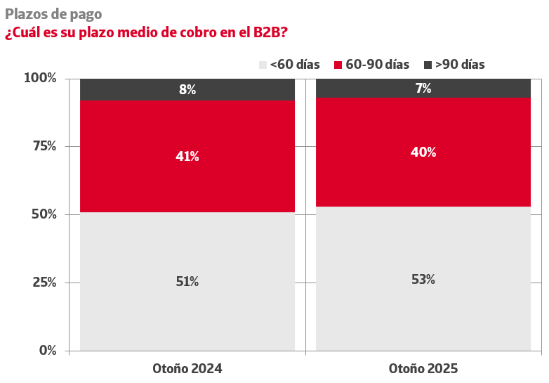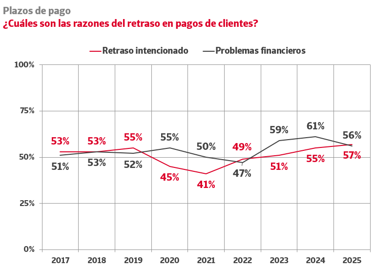 Un 56% de las empresas percibe problemas financieros en sus clientes, cinco puntos porcentuales menos que hace un año. Sin embargo, aumentan los niveles relativos a los retrasos intencionados por parte del cliente, alcanzando el 57% frente al 55% de 2024.