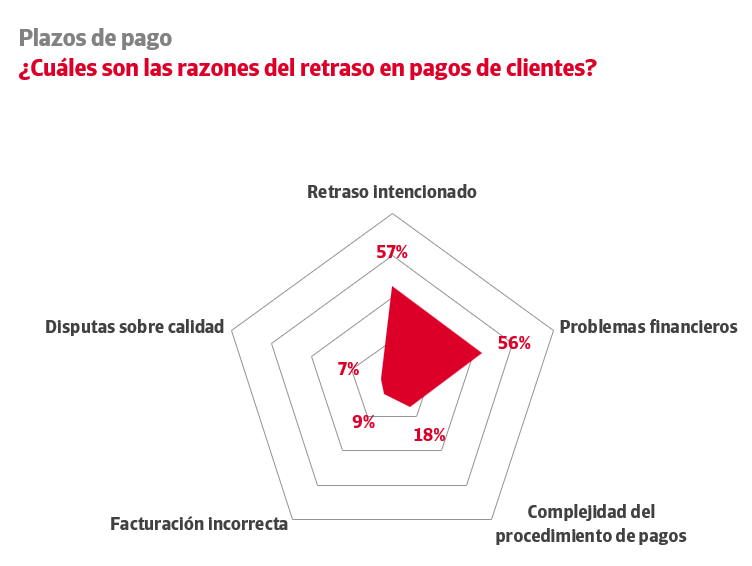 La complejidad del procedimiento de pagos (18%), la emisión de facturas incorrectas (9%) o las disputas sobre la calidad de los bienes y servicios suministrados (7%) siguen estando entre las principales razones del retraso en los pagos.