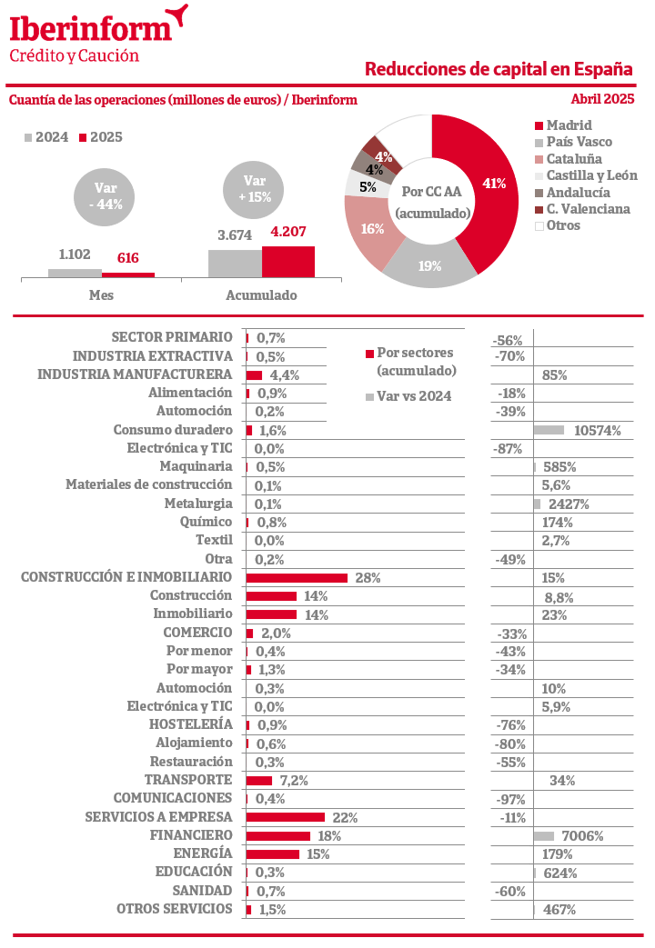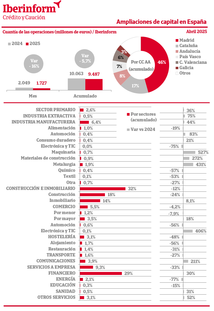 Respecto a las ampliaciones de capital, de acuerdo con el seguimiento que realiza Iberinform de los datos publicados en el Registro Mercantil, el número de operaciones ha registrado un decrecimiento interanual del -10% en abril y del -1,6% en el conjunto del año. En cuanto al importe de las ampliaciones, el saldo agregado de estas operaciones que refuerzan la solvencia empresarial acumula una bajada del -5,7% en 2025.