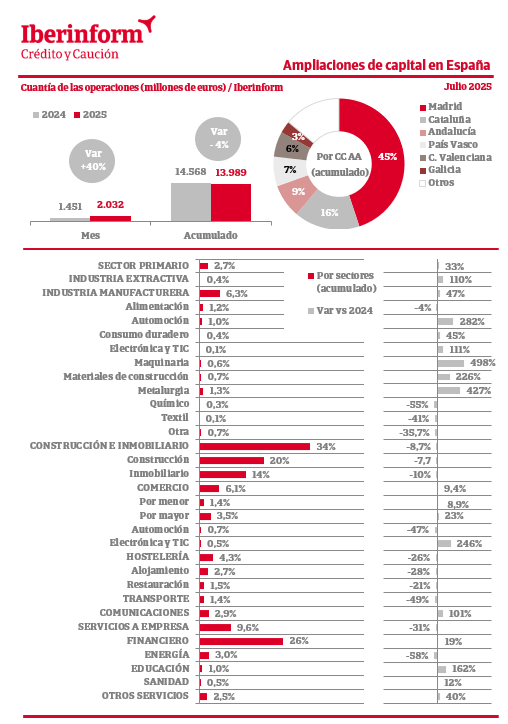 Respecto a las ampliaciones de capital, de acuerdo con el seguimiento que realiza Iberinform de los datos publicados en el Registro Mercantil, el número de operaciones ha registrado en julio un crecimiento anual del 8%, mientras en el conjunto del año el incremento es de apenas el 0,5%. En cuanto al importe de las ampliaciones, el saldo agregado de estas operaciones que refuerzan la solvencia empresarial acumula una bajada del -4% en 2025.