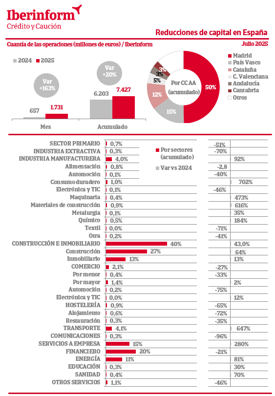 De acuerdo con el seguimiento que realiza Iberinform de los datos publicados en el Registro Mercantil, el número de reducciones de capital en el tejido empresarial ha registrado en julio un aumento interanual del 3%. En el acumulado, el número de reducciones registra una subida del 1,8%. En cuanto a su importe, el saldo agregado en los siete primeros meses del año refleja un incremento del 20%, con respecto al mismo periodo de 2024. El principal motivo por el que se lleva a cabo una reducción de capital es la compensación del impacto de las pérdidas económicas en el patrimonio neto. En este sentido, la sociedad puede reducirlo con el fin de establecer una estructura financiera más acorde a su nueva situación.
